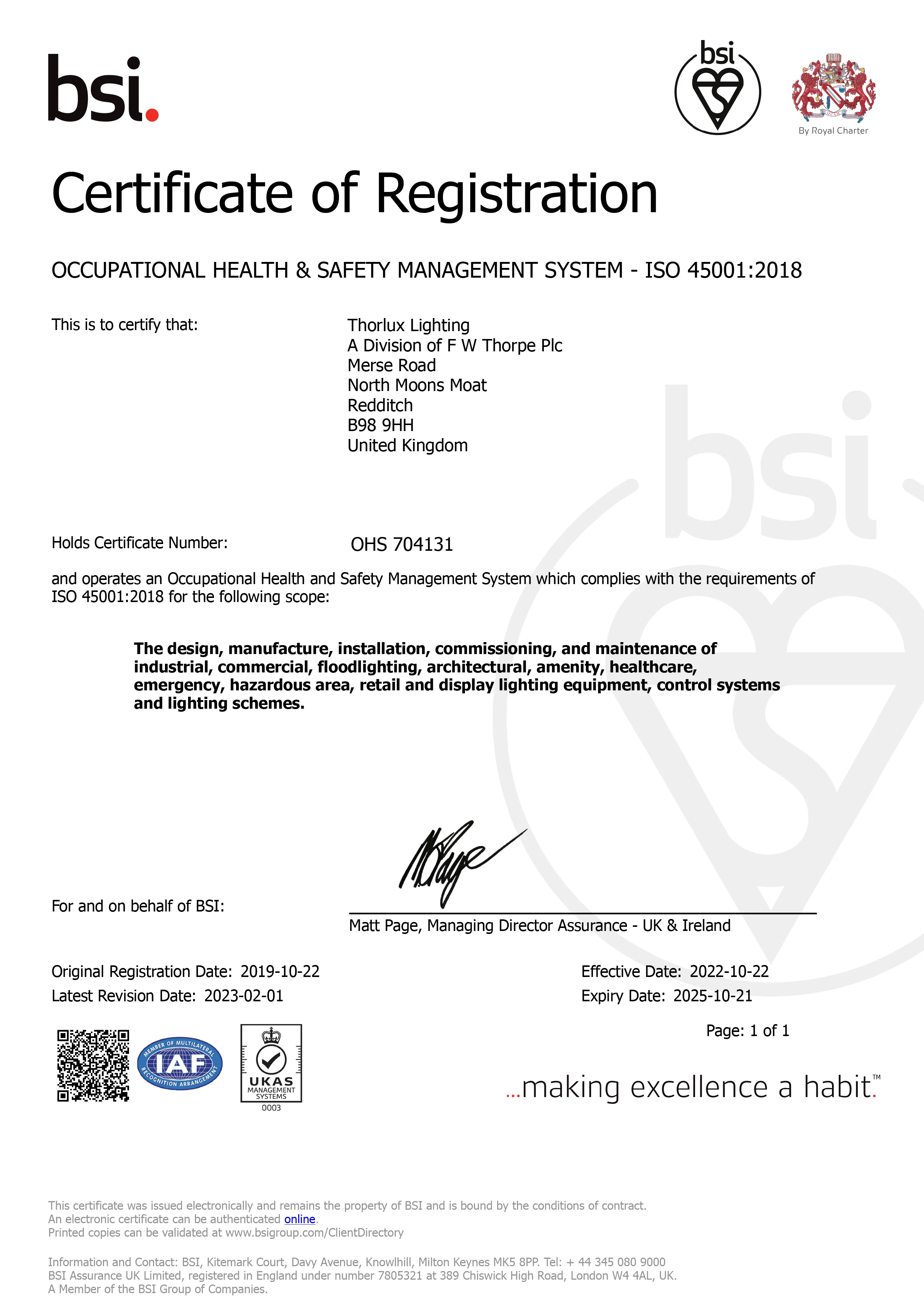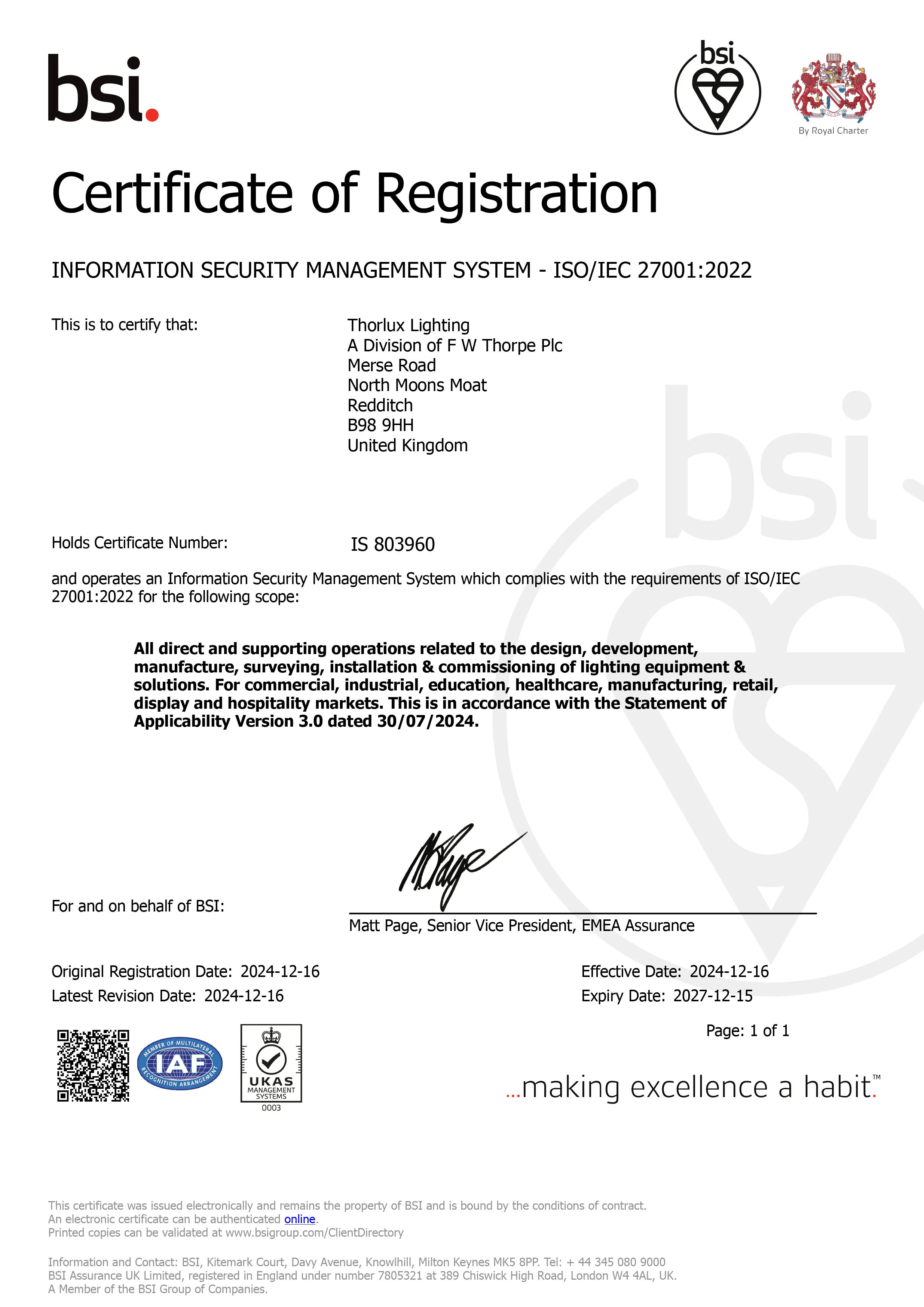Thorlux is proud to also hold ISO 45001:2018 for Health and Safety Management certification, covering not only its offices and factory but also the off-site activities of its installation, commissioning, and maintenance teams. Finally, Thorlux has been certified to ISO/IEC 27001:2022 for information security, recognising the high standards of confidentiality and integrity with which the company handles data.