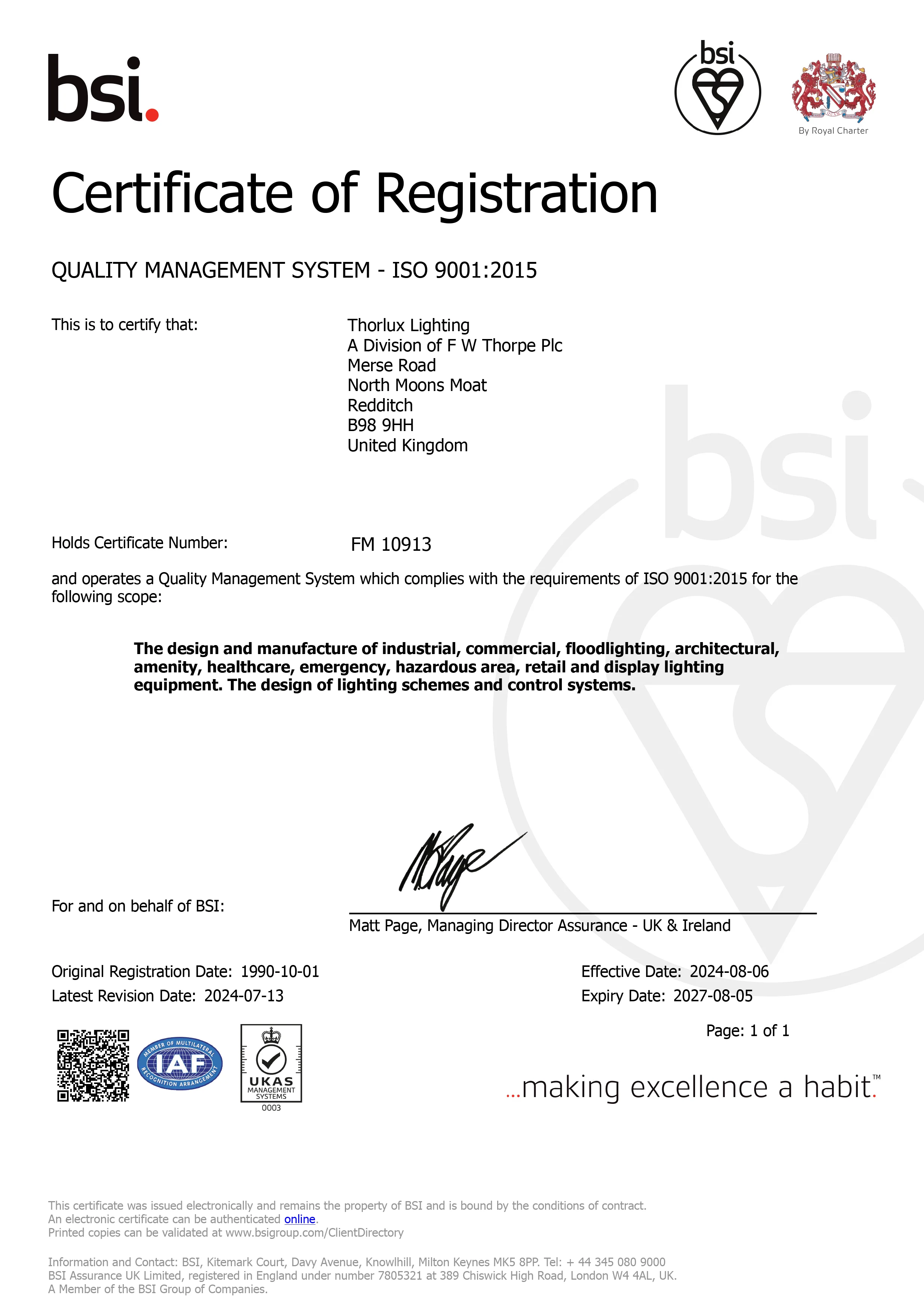 Thorlux is assessed to ISO 9001:2015, assuring customers that it manufactures its luminaires to the most stringent quality controls. Additionally, ISO 14001:2015 certification guarantees that Thorlux makes its products in the most environmentally friendly manner.