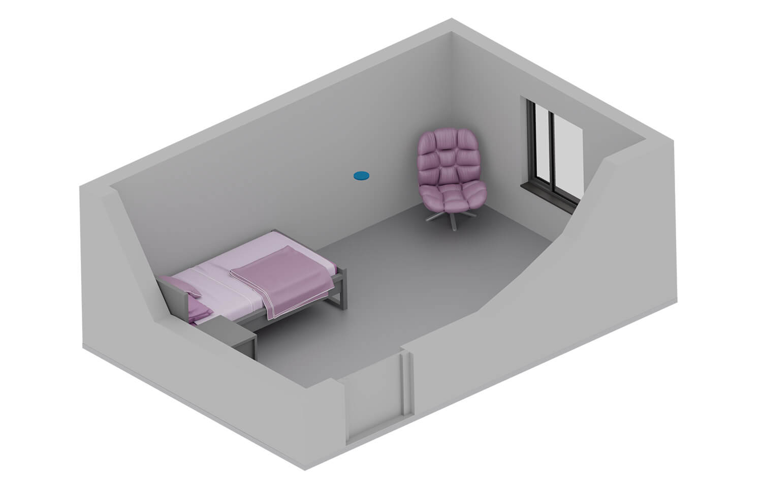 Quiet rooms can be used for seclusion or de-escalation so design should be flexible to allow for such use. Seclusion rooms are single function rooms with an en-suite designed for low levels of stimuli and to prevent self-harm. Ceiling heights are typically 3m and all luminaries need to be robust, tamperproof and anti-ligature. The luminaires should be ceiling mounted and switched from outside the room.