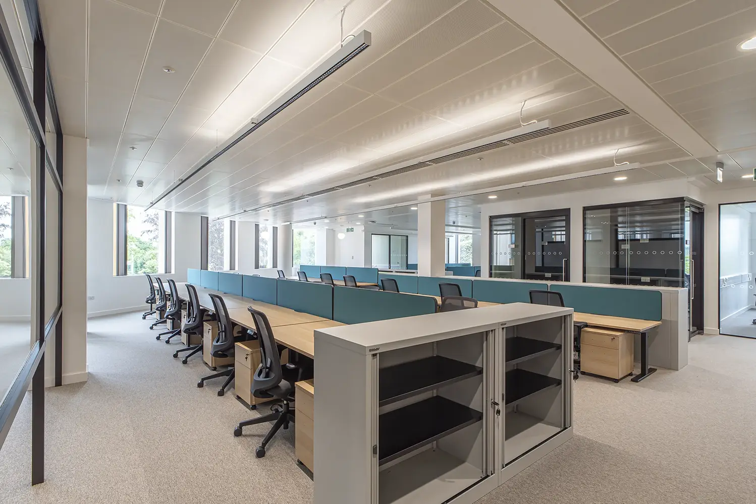 Emergency Lighting is a fundamental safety requirement for offices. The minimum requirements are 1 lux down the centreline of corridors used as escape routes, and 0.5 lux in open spaces >60 m². Exit signs are required.