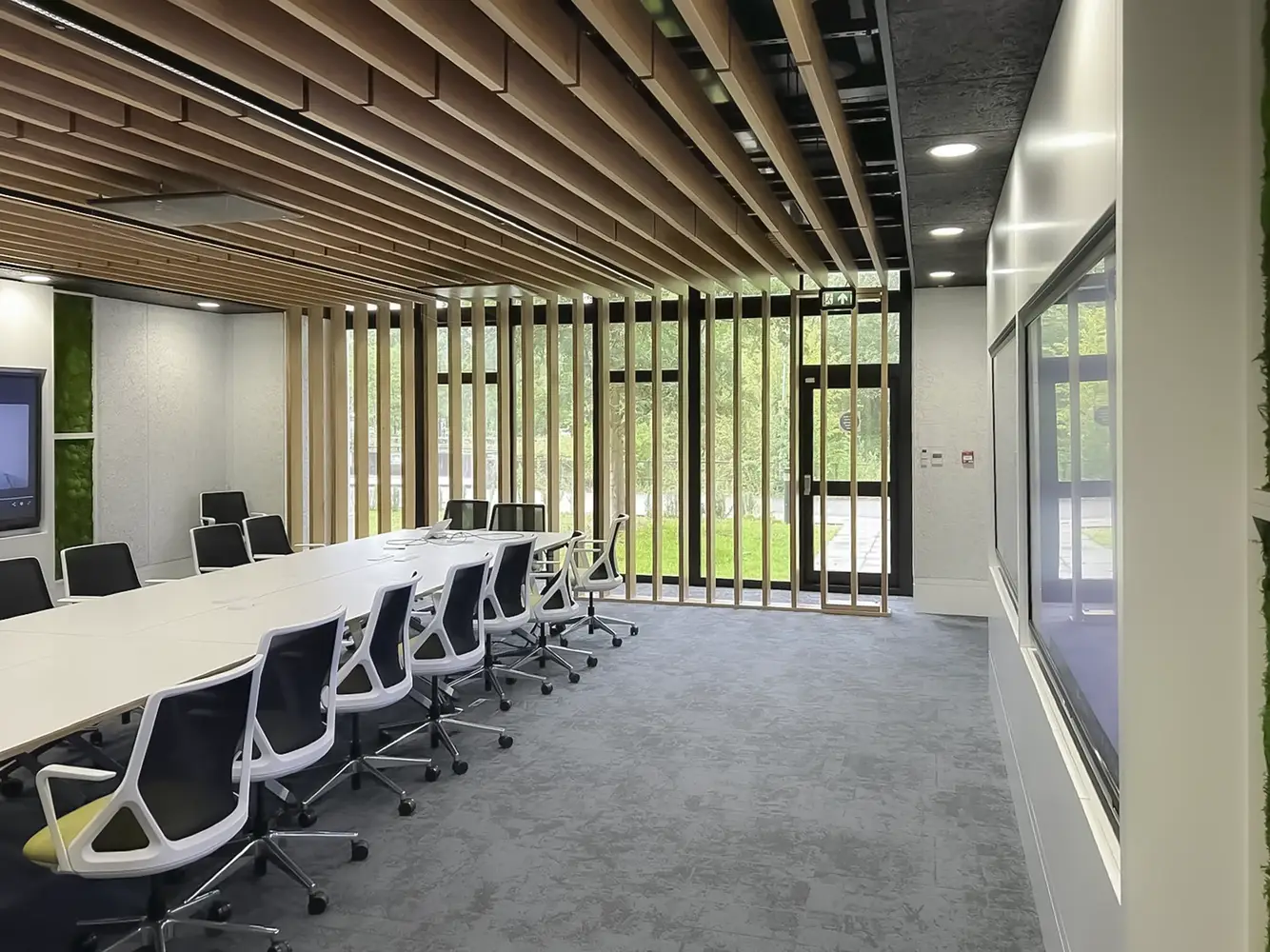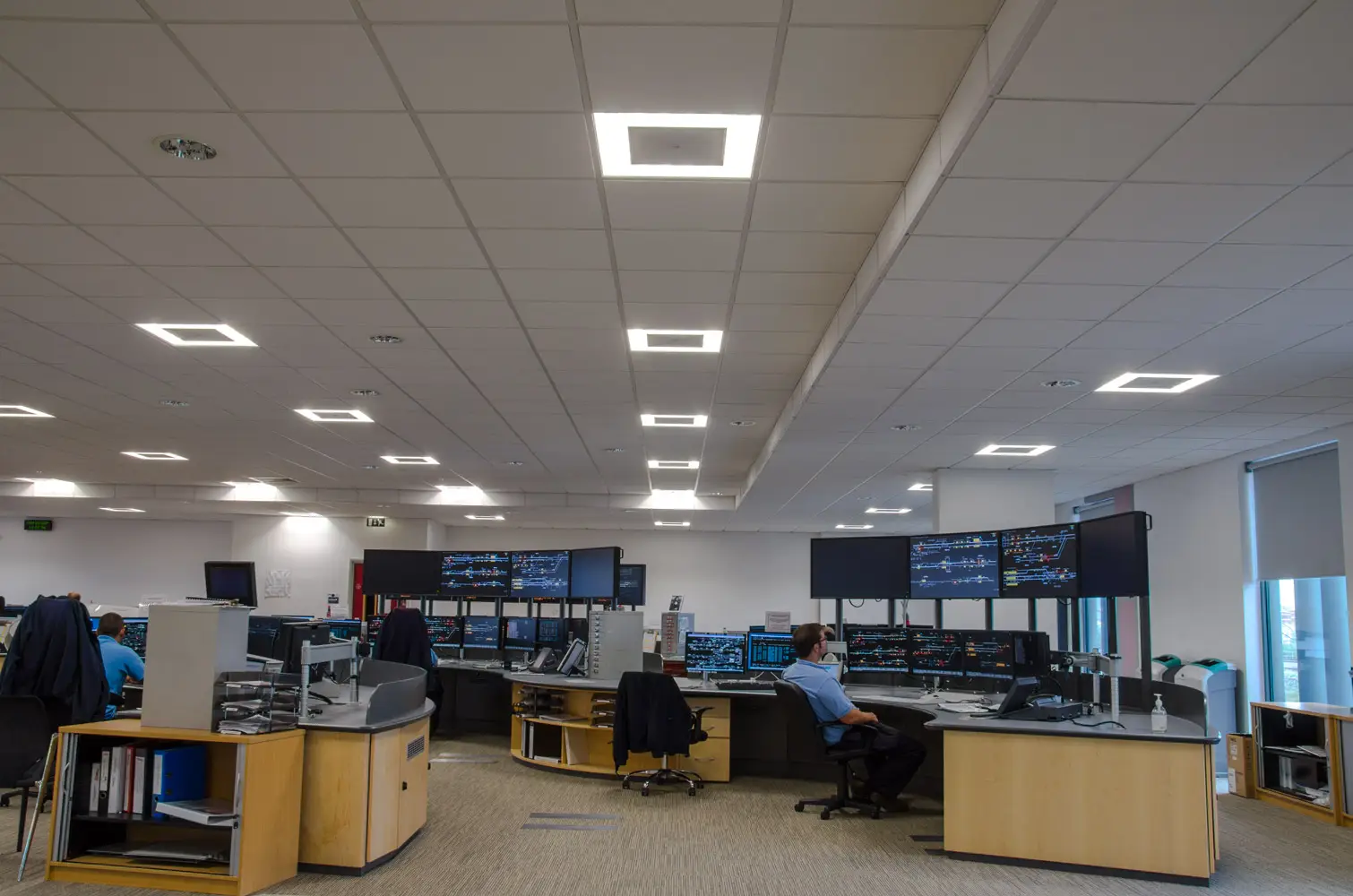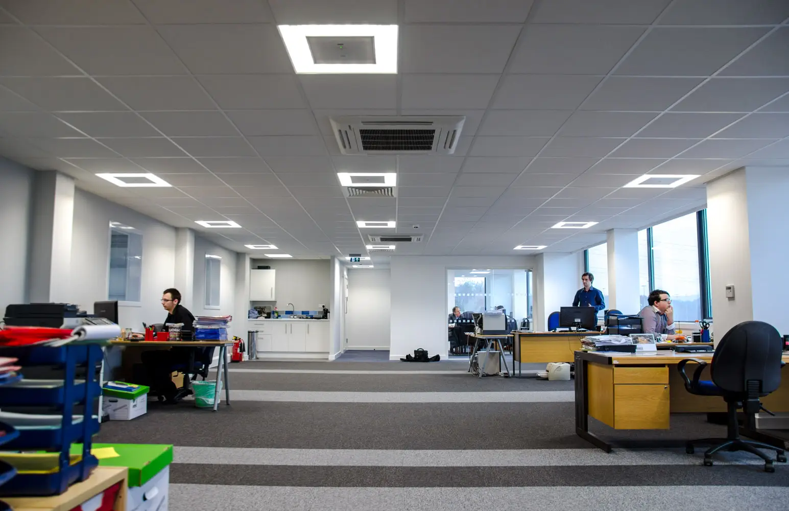 A modular array of luminaires in an open plan office allows the space to be partitioned to create cellular offices and meeting rooms. Almost all open plan offices consist of groups of computer work-stations, so low glare luminaires must be used.