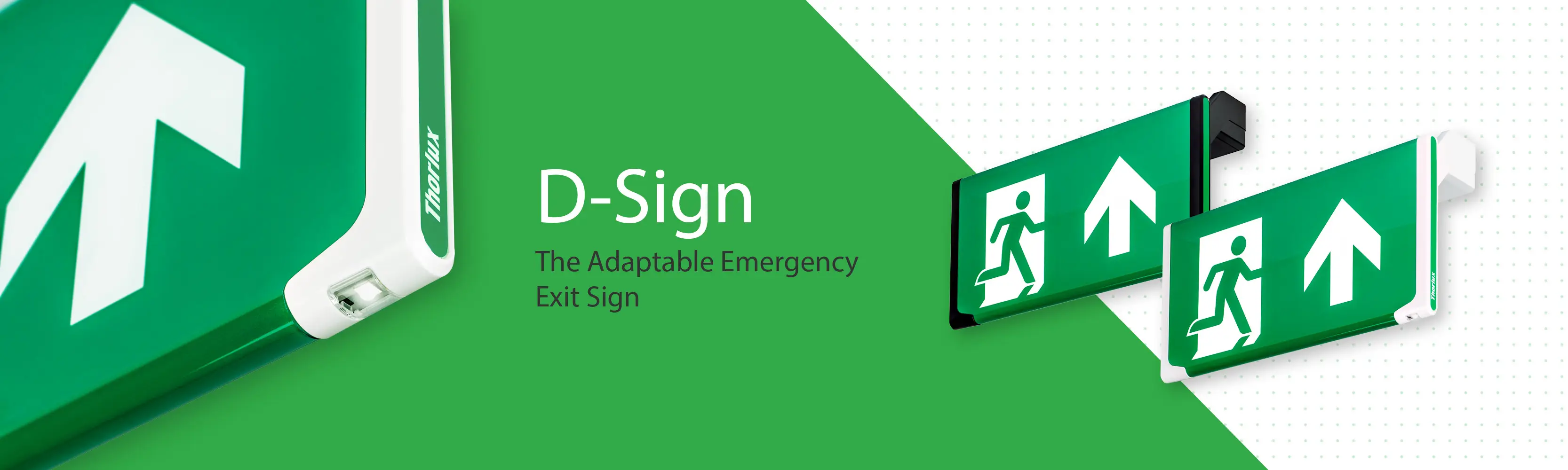 The D-Sign is a slim, unobtrusive exit sign designed to fit subtly into its environment, but to be highly effective when needed. The innovative design allows adjustment between wall and ceiling mounting configurations without the need for accessories or tools. The body is available in both black and white finishes, and the large format legend provides an impressive 23-metre viewing distance, making it ideal for a wide variety of applications. An additional LED provides dedicated downward light for the illumination of the exit routes or points of emphasis.