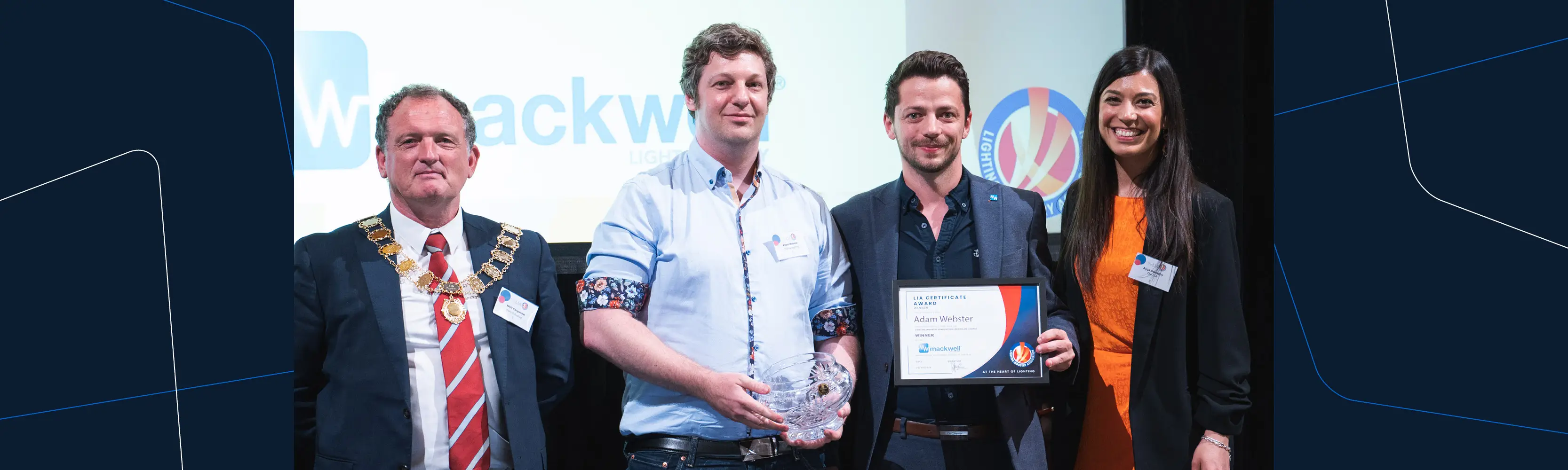 Adam received the LIA Certificate Award for Outstanding Achievement for the superior quality of his work on his professional LIA qualification. The award was presented by Lighting Industry Association President, Matt Carpenter, who spoke generously of Adam’s project.