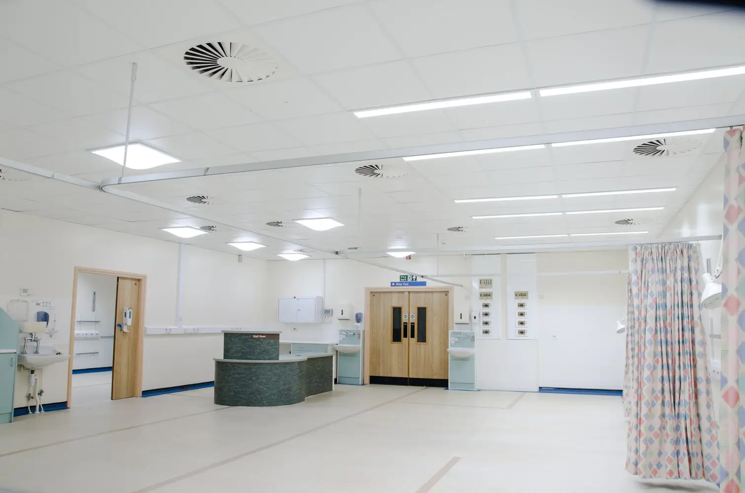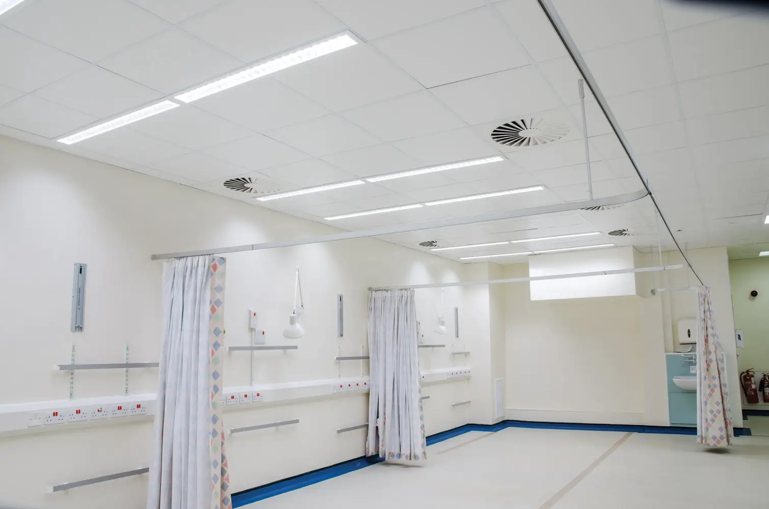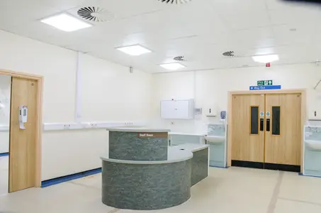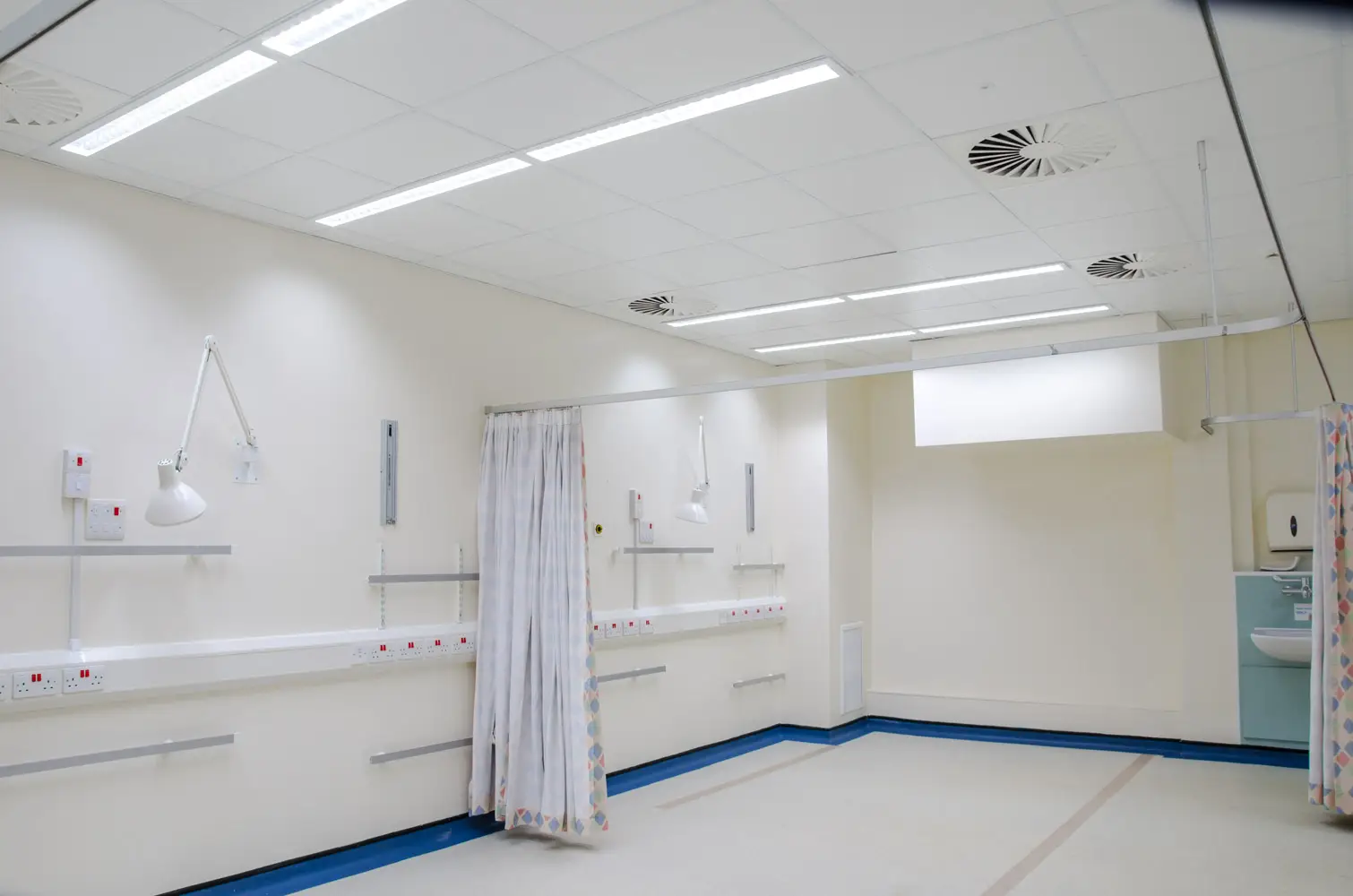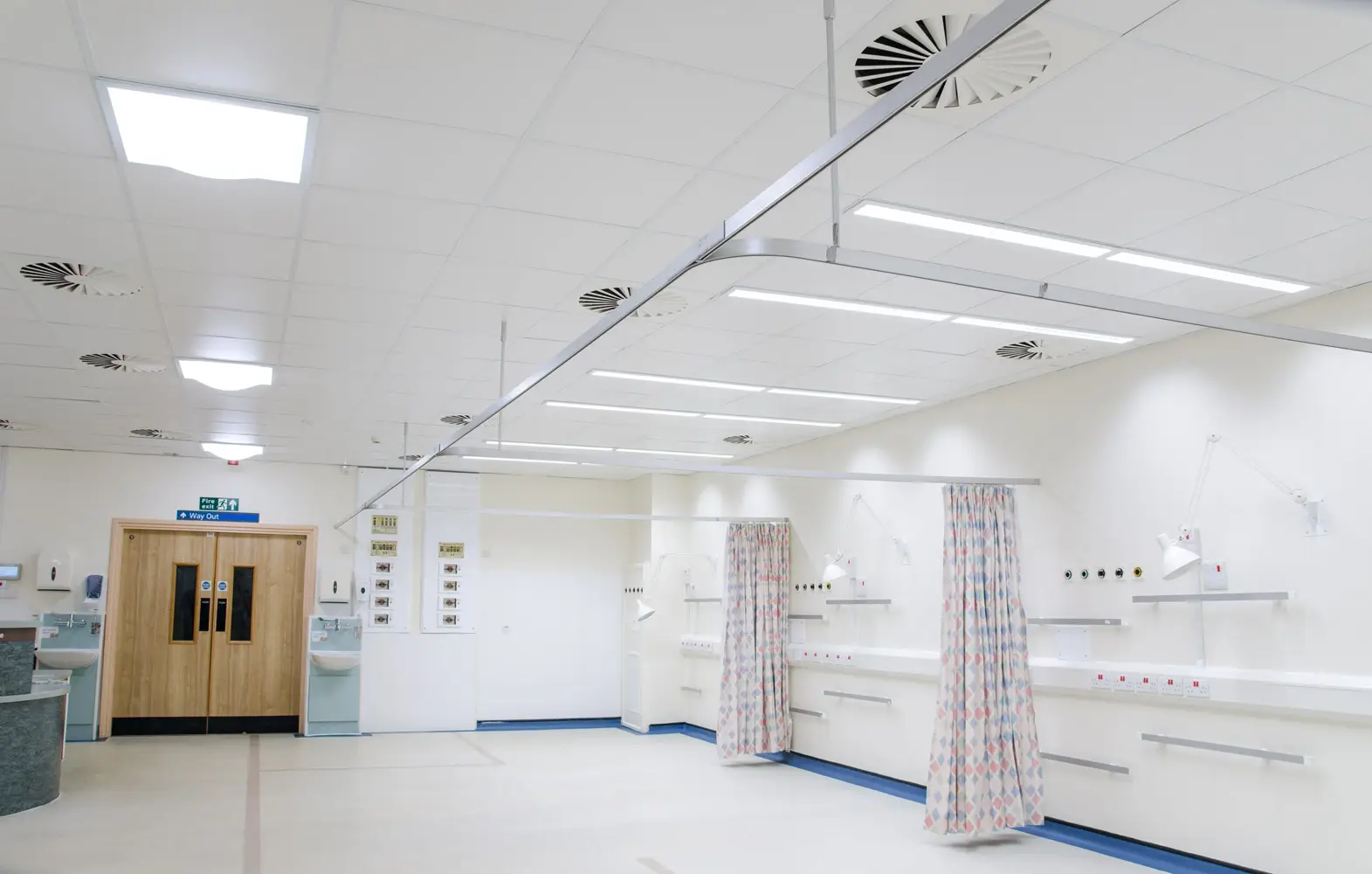 The lighting control system installed is from the Thorlux ColourActive range, which cycles the colour temperature of the light source over a 24 hour period. The colour temperature (CCT) of the luminaires varies from 3000K to 6500K to replicate natural daylight changes. In addition, the system is dimmable providing individual lighting level control within each bed bay, whilst maintaining outstandingly high uniformity and a shadow free working platform for staff. Crash scenes are included at each bedhead, and for the full ward, to give maximum output (1000 lux +) from one fail safe switch.