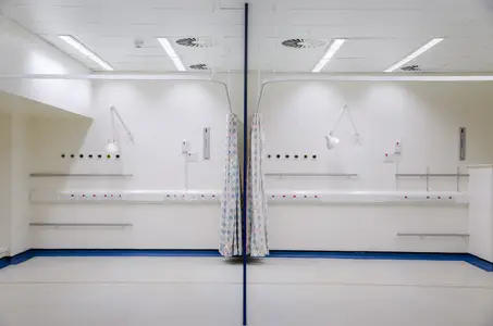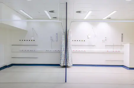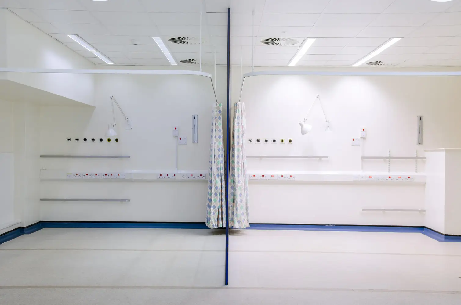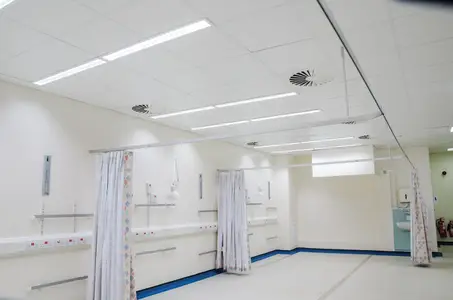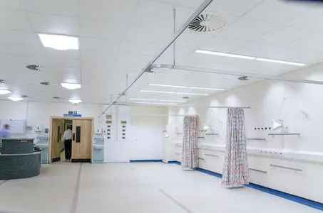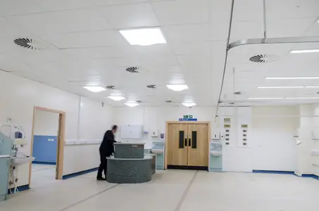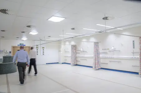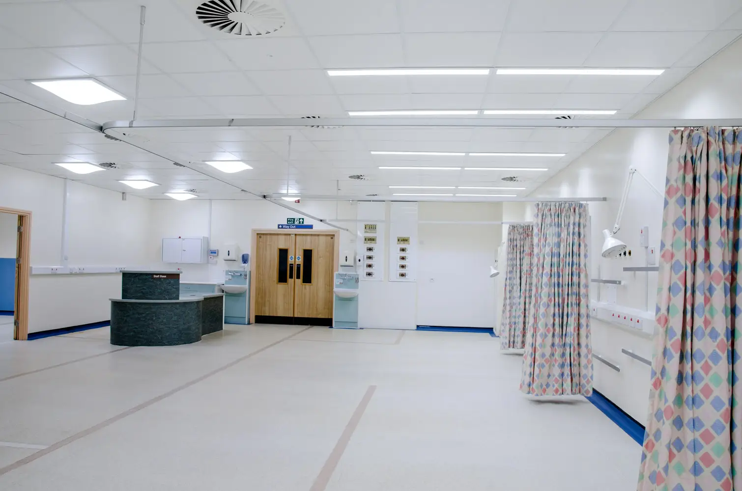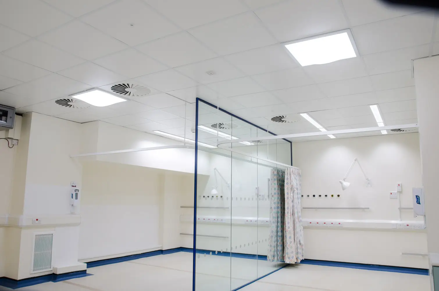 The lighting control system installed is from the Thorlux ColourActive range, which cycles the colour temperature of the light source over a 24 hour period. The colour temperature (CCT) of the luminaires varies from 3000K to 6500K to replicate natural daylight changes. In addition, the system is dimmable providing individual lighting level control within each bed bay, whilst maintaining outstandingly high uniformity and a shadow free working platform for staff. Crash scenes are included at each bedhead, and for the full ward, to give maximum output (1000 lux +) from one fail safe switch.
