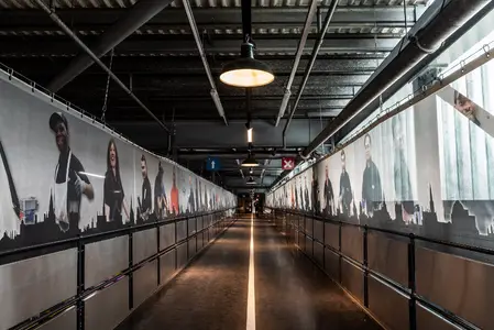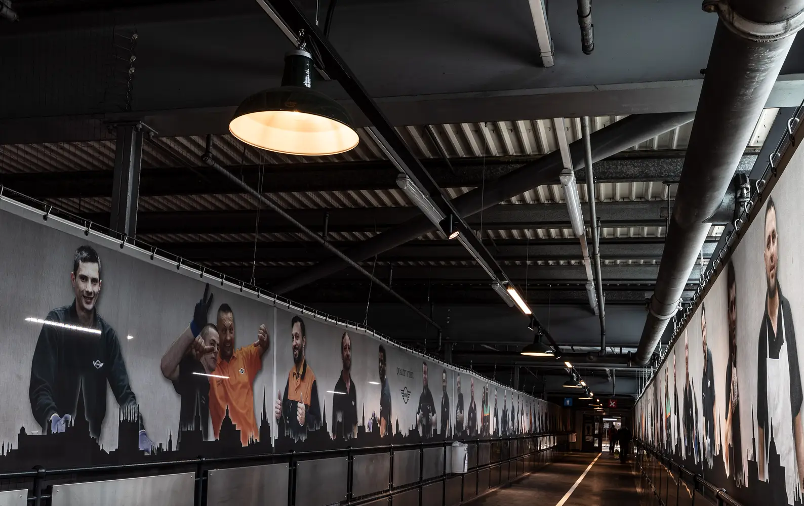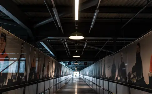 The access bridge at this car assembly plant in Oxford has been illuminated using a combination of black Zipline, Pitch spotlights and Traditional pendant luminaires. The new lighting installation creates a more visually interesting space while highlighting the wall mounted images.