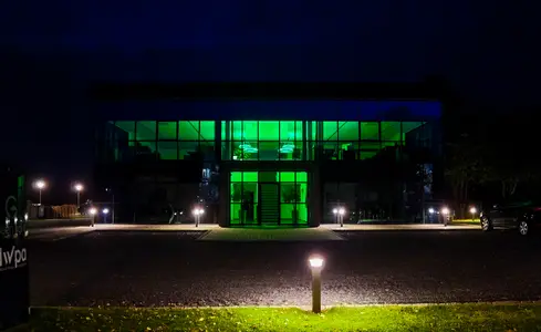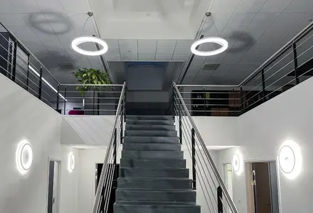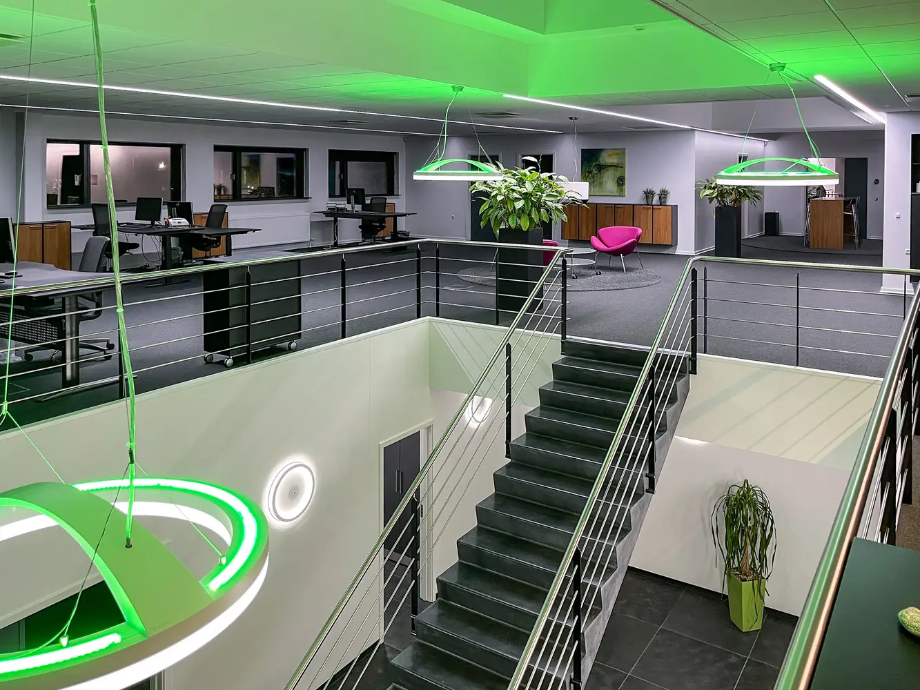 The lighting scheme features four suspended Clara 720 luminaires, set to provide a green uplight effect during the evenings when no movement is detected. Additionally, wall-mounted Ovix luminaires have been fitted around the stairs leading to the first floor; several of these are configured to provide emergency lighting coverage. The powerful SmartScan wireless system provides Green Light with energy consumption data while maximizing efficiency. This new lighting scheme provides an impressive effect that amplifies Green Light’s corporate branding.