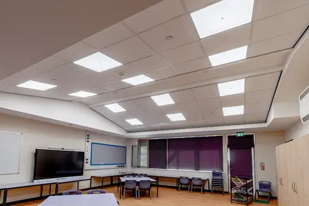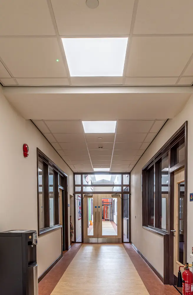 To prevent energy wastage and ensure optimum building efficiency, most of the supplied luminaires use discrete Smart sensors. This means each luminaire only illuminates when the area is in use, and it monitors ambient light to control its output at the correct level. Additionally, Thorlux has been independently confirmed as being carbon neutral since 2012, further bolstering the sustainability credentials of the new school building.