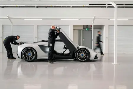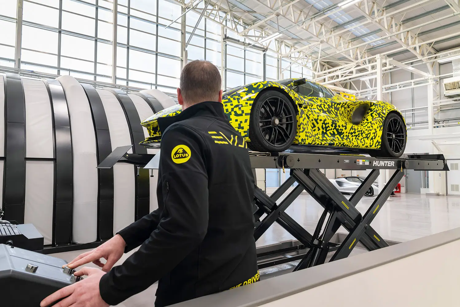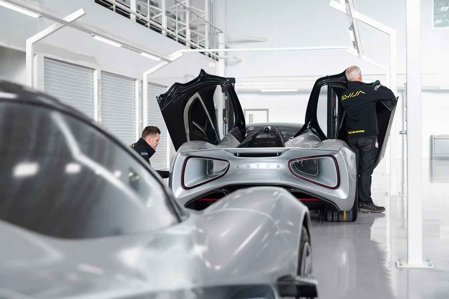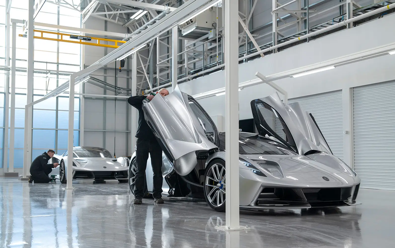 Work on the new Evija factory began in summer 2019. The interior has been fitted on three sides with gantries which frame the build stations. These have been designed and engineered to be sleek and unobtrusive, though robust enough to carry the necessary power, data and compressed air systems required for assembly. The result is a versatile and inspiring workspace that will see Lotus hand-build up to 130 examples of the Evija.
