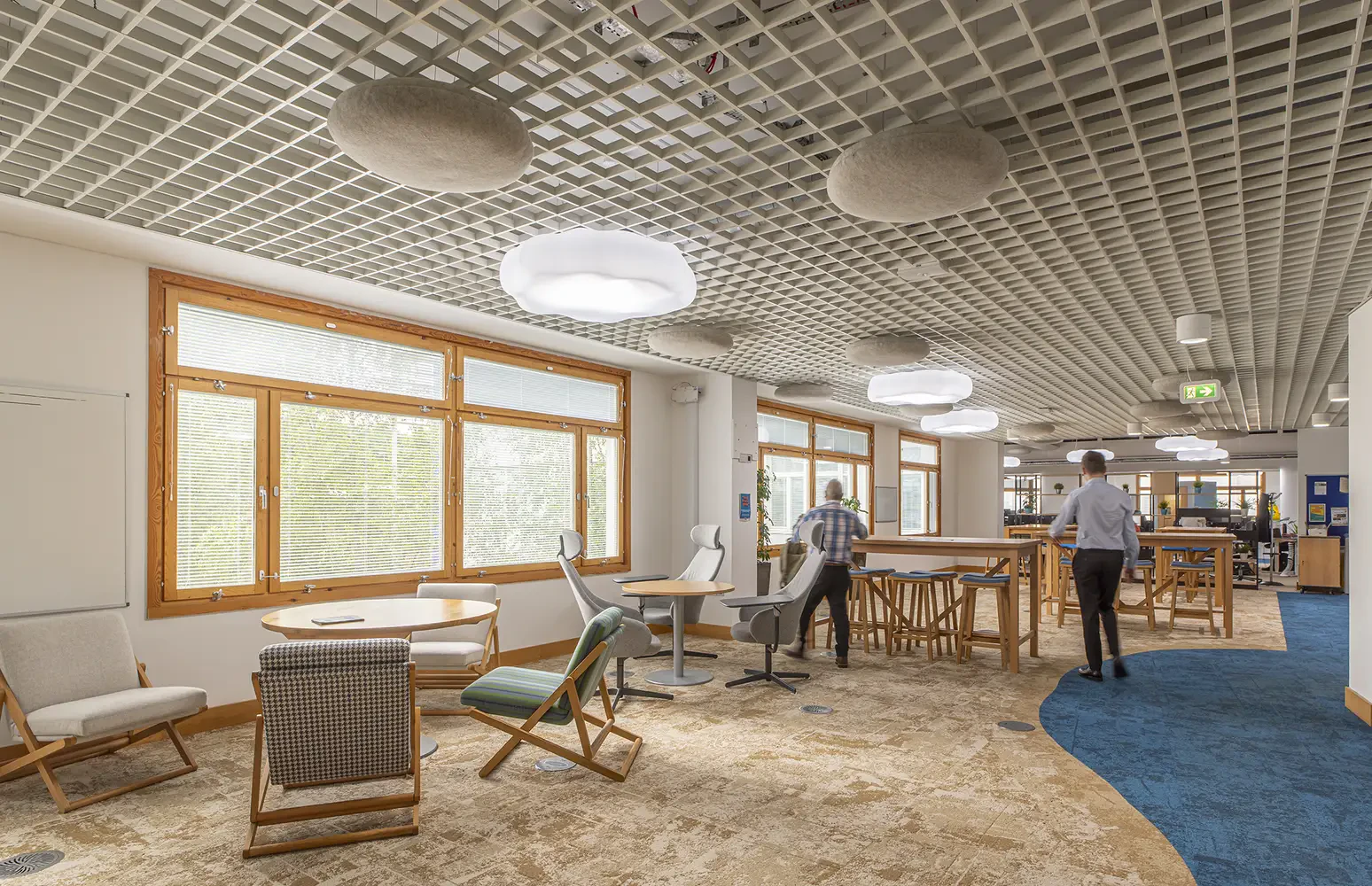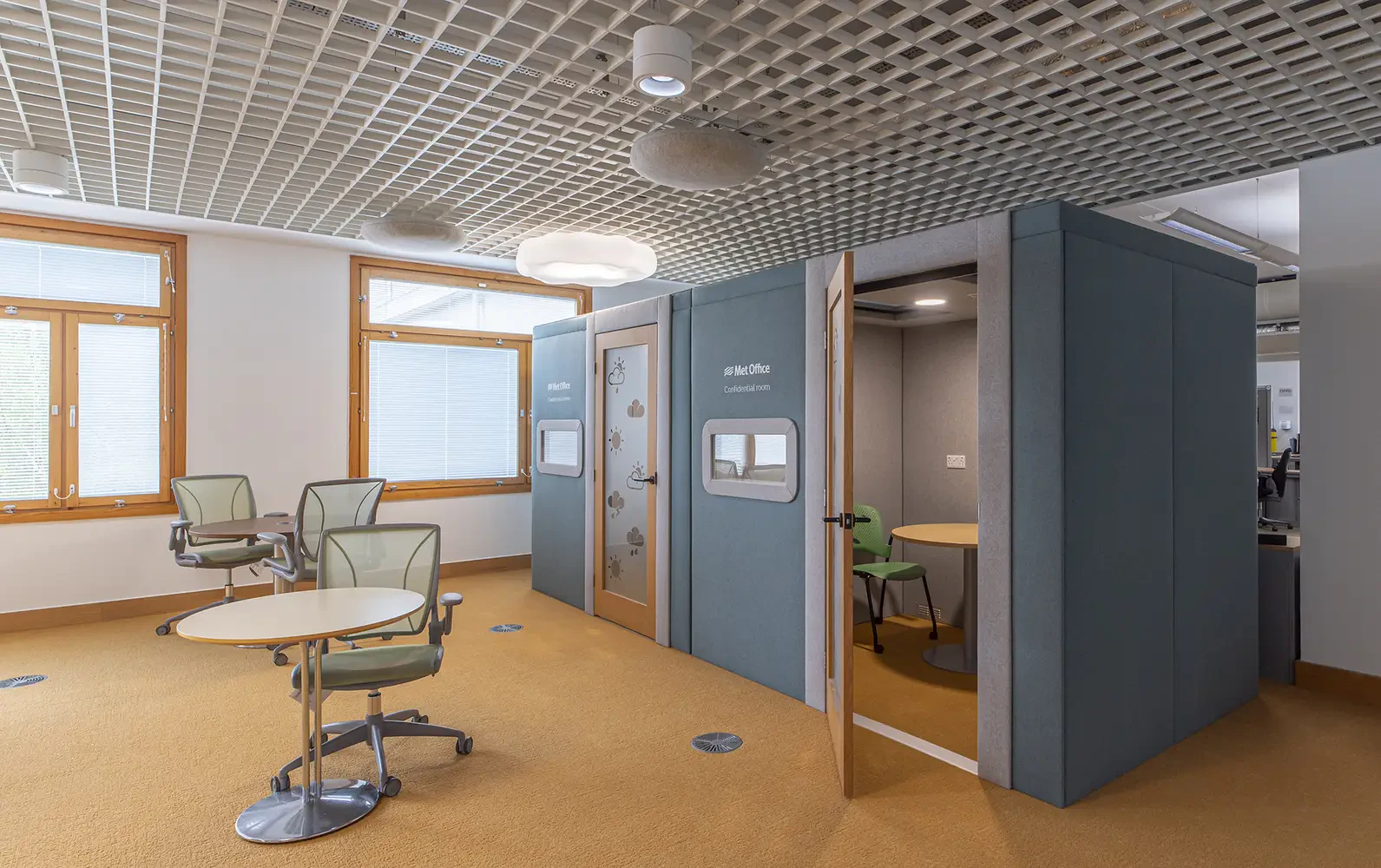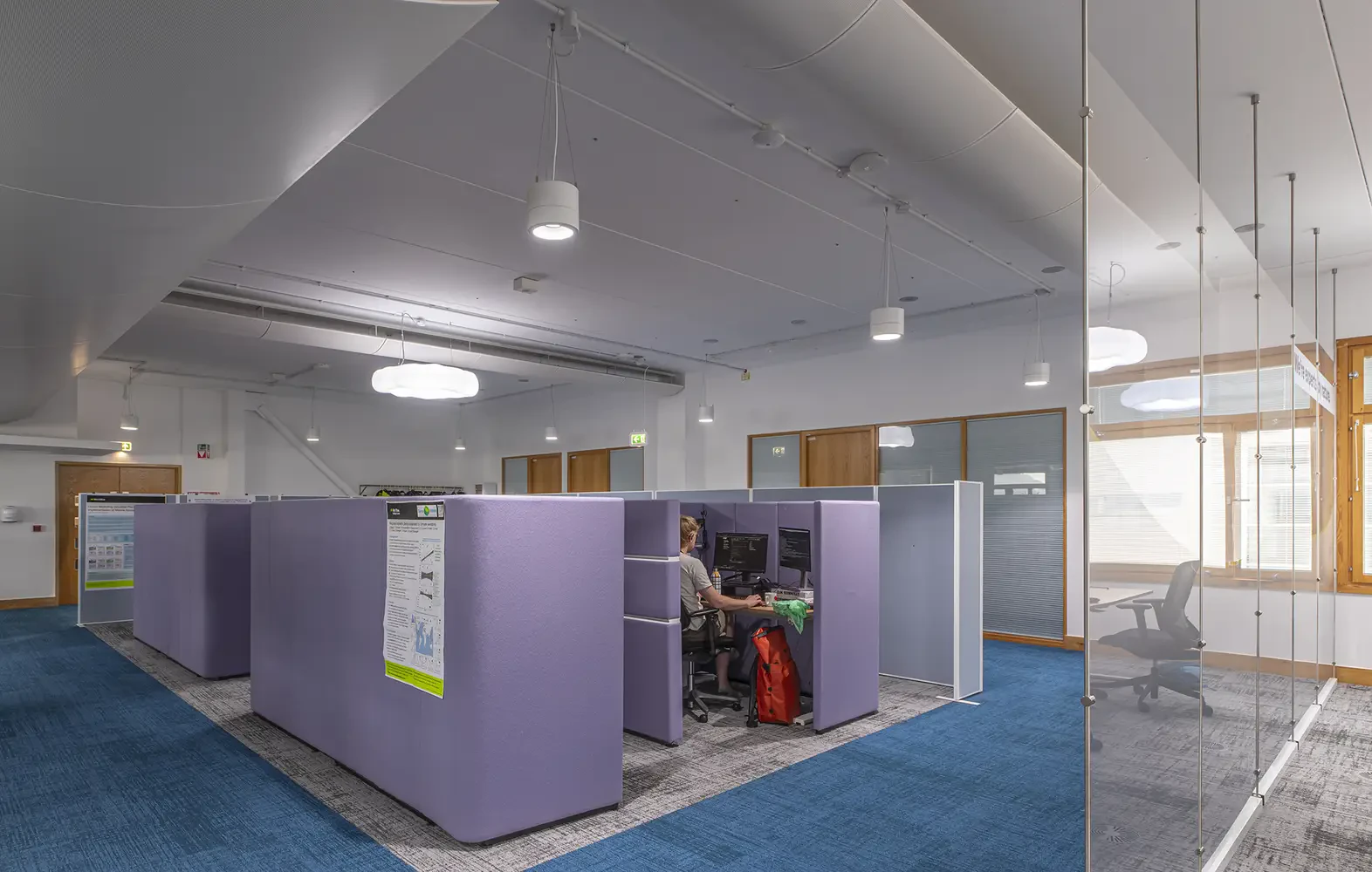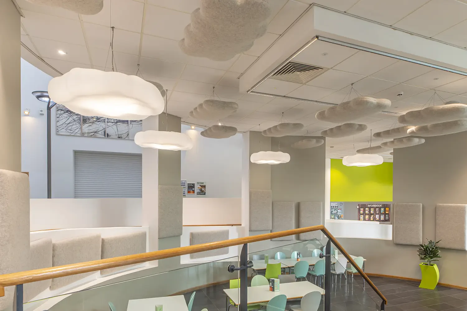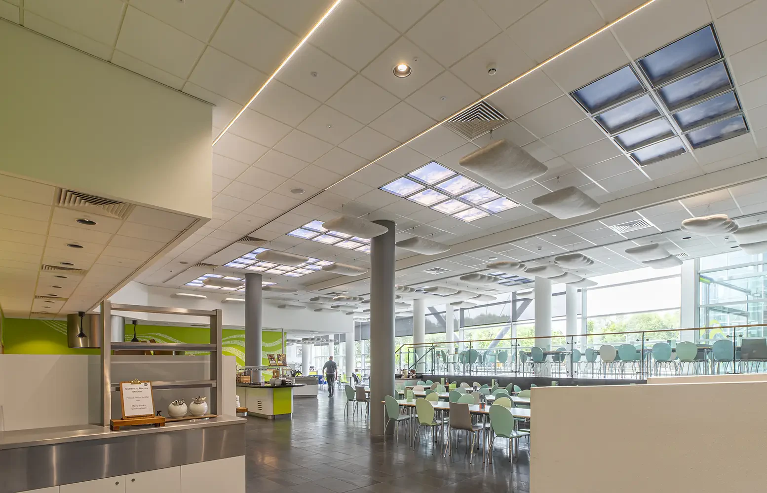Thorlux Lighting has specified and supplied a SmartScan-controlled lighting system in the Met Office restaurant area. Thorlux Cloud suspended luminaires, coupled with edge-lit Flexview ‘skylight’ recessed picture luminaires, provide an inspirational, light-hearted connection to the Met Office’s weather-forecasting duties. The Cloud luminaires’ ColourActive technology provides automated colour temperature control, configured via the SmartScan website, with preset modes that mimic natural daylight patterns or can be customised as needed. The luminaires connect wirelessly to a ColourActive Gateway, which updates them every few minutes to ensure smooth and consistent lighting transitions during the day. The restaurant lighting scheme also features linear Flexline luminaires and G3 recessed downlighters.