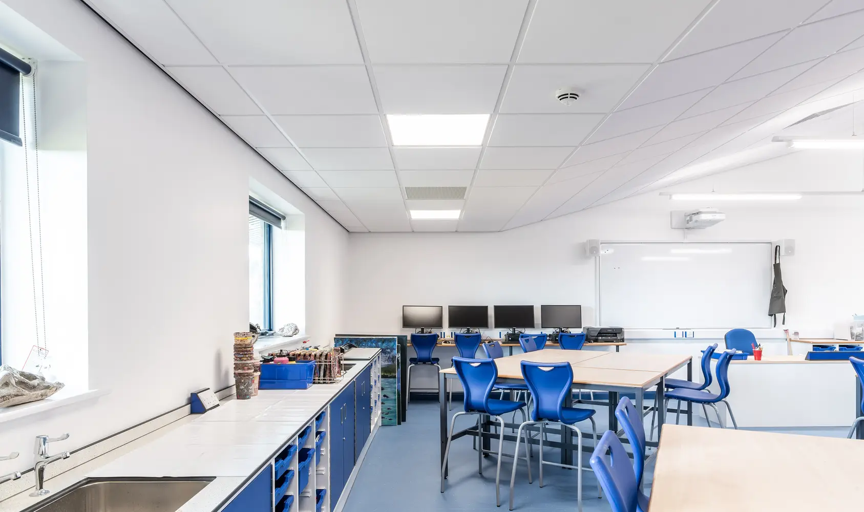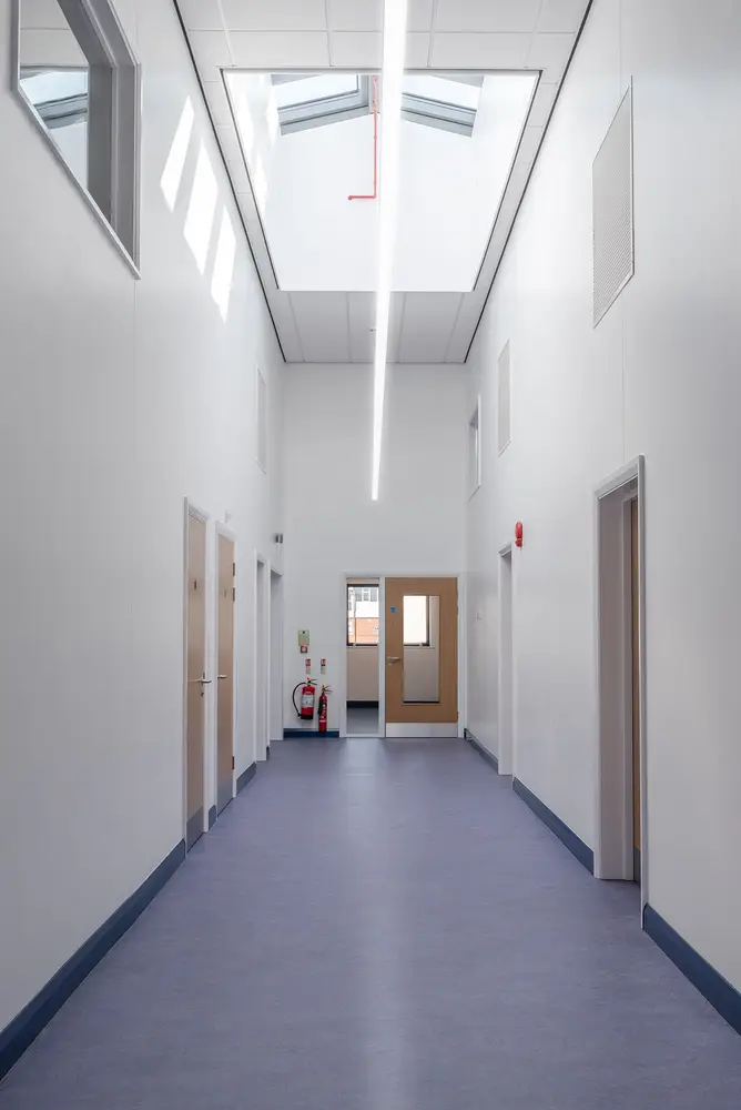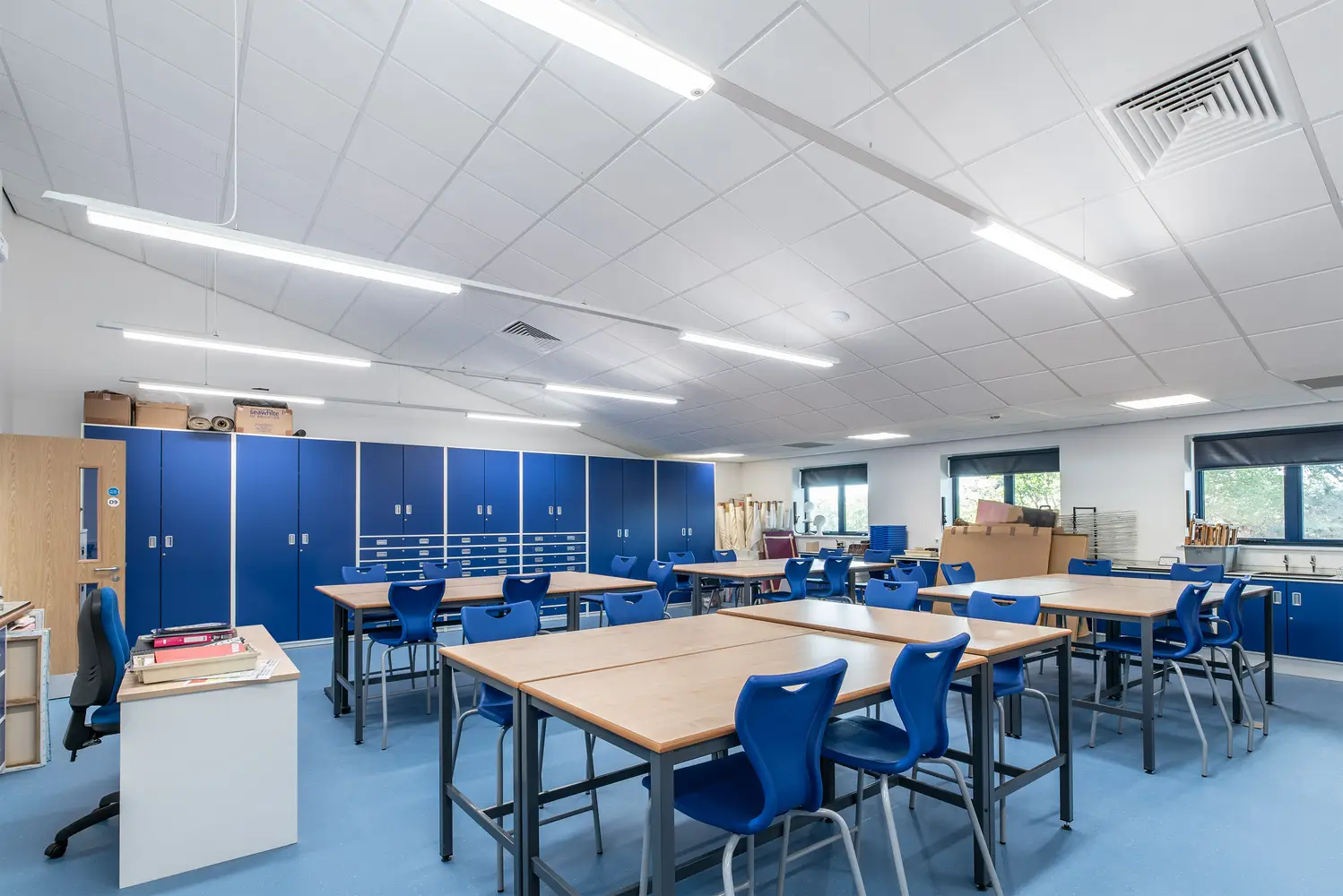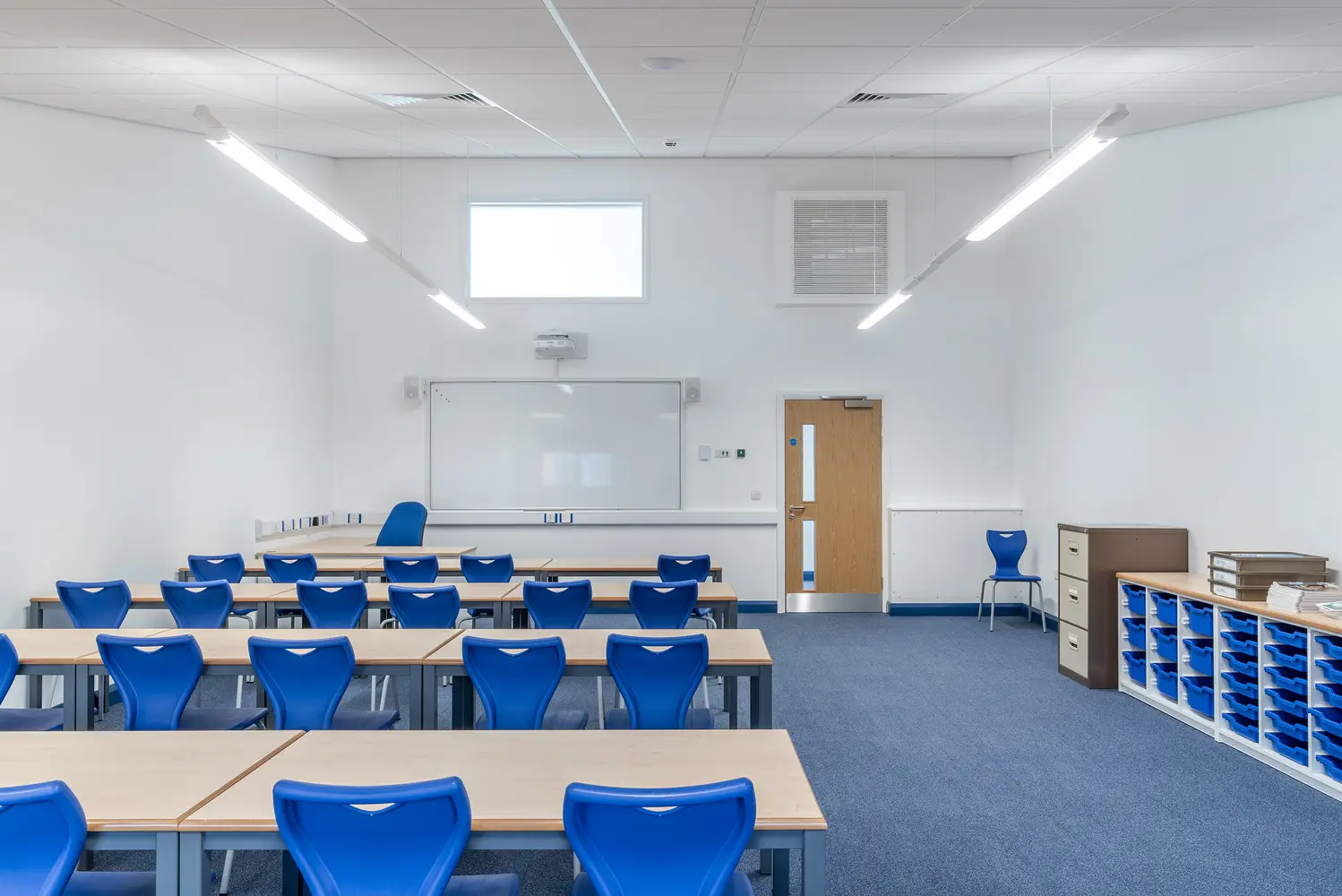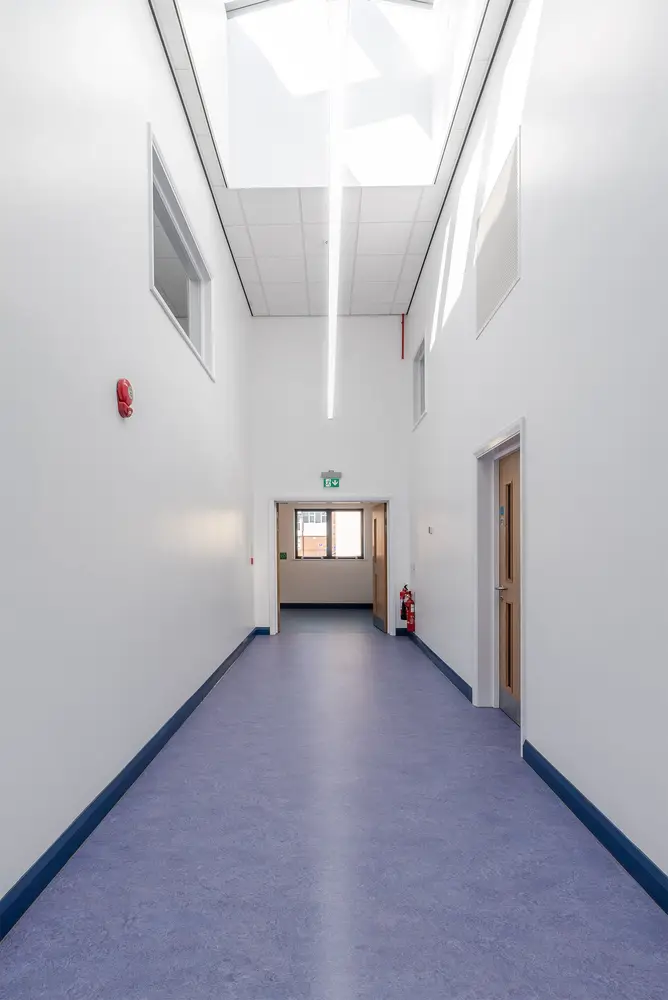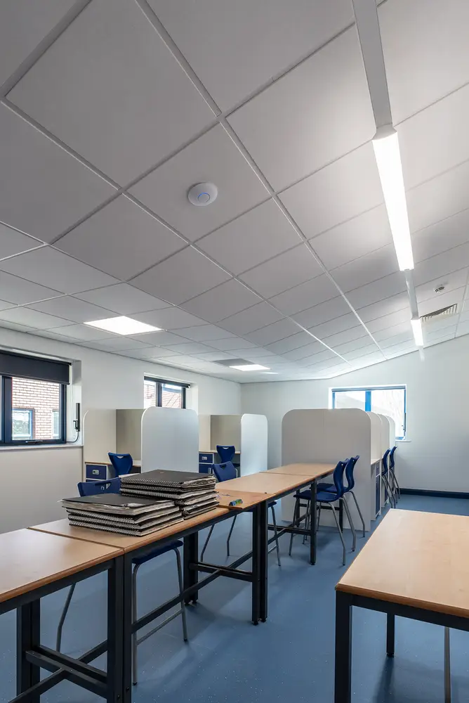 The Thorlux Flex System has been installed in a number of the new classrooms. The Flexline breaks from convention taking the lighting outside of the ceiling tile offering freedom and flexibility of scheme design. Combined with this, the dual light engine in the Flexview brings a touch of the outside inside with its illuminated picture window. Separate high-performance optics provide the main space illumination ensuring quality and efficiency.