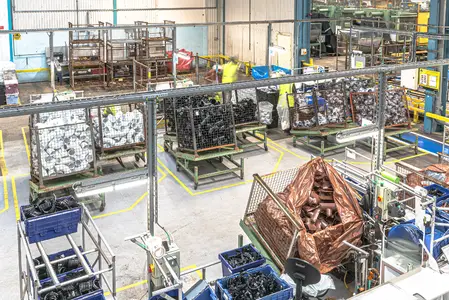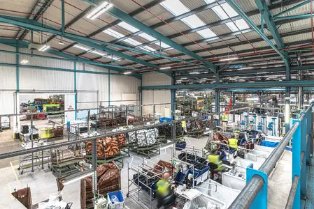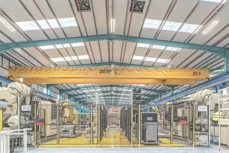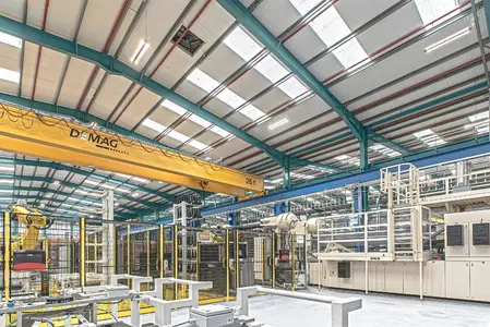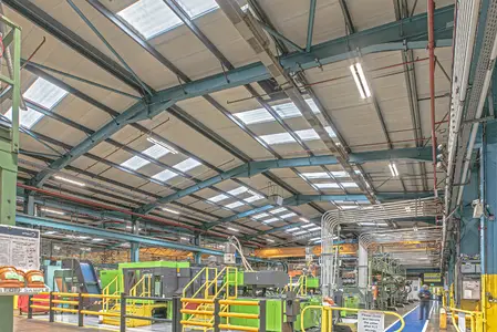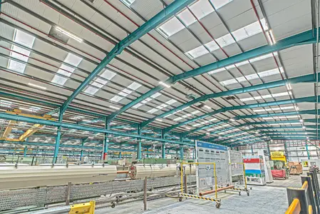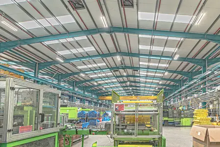 The nine-bay factory is lit primarily with Visio and Visio Pro high-bay luminaires with wide-angled lighting distribution. Corrosion-resistant Thoroproof luminaires are used in key workshop areas. In the warehouse building, narrow-distribution Visio luminaires are used between the racks. The site canteen is lit with Hi-Style 600x600 recessed units, and the open-plan office building makes striking use of linear, low-glare Kanby Pro luminaires.