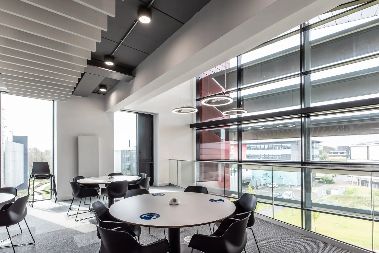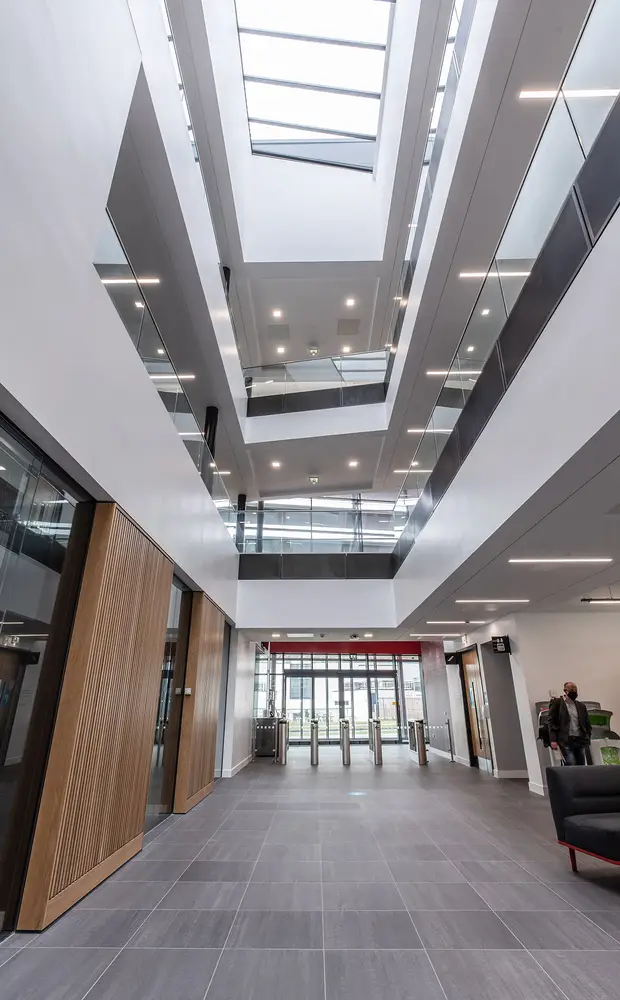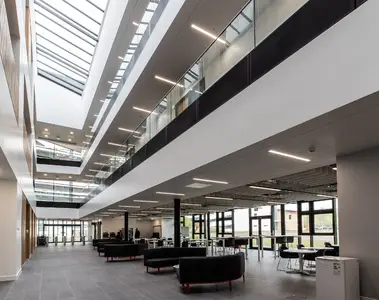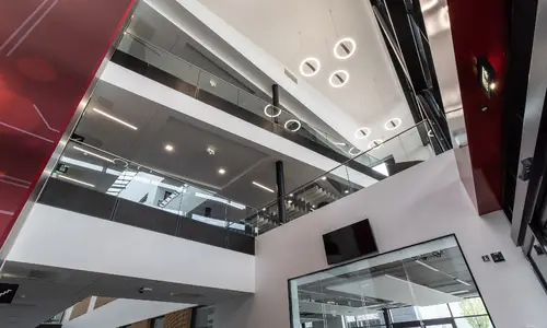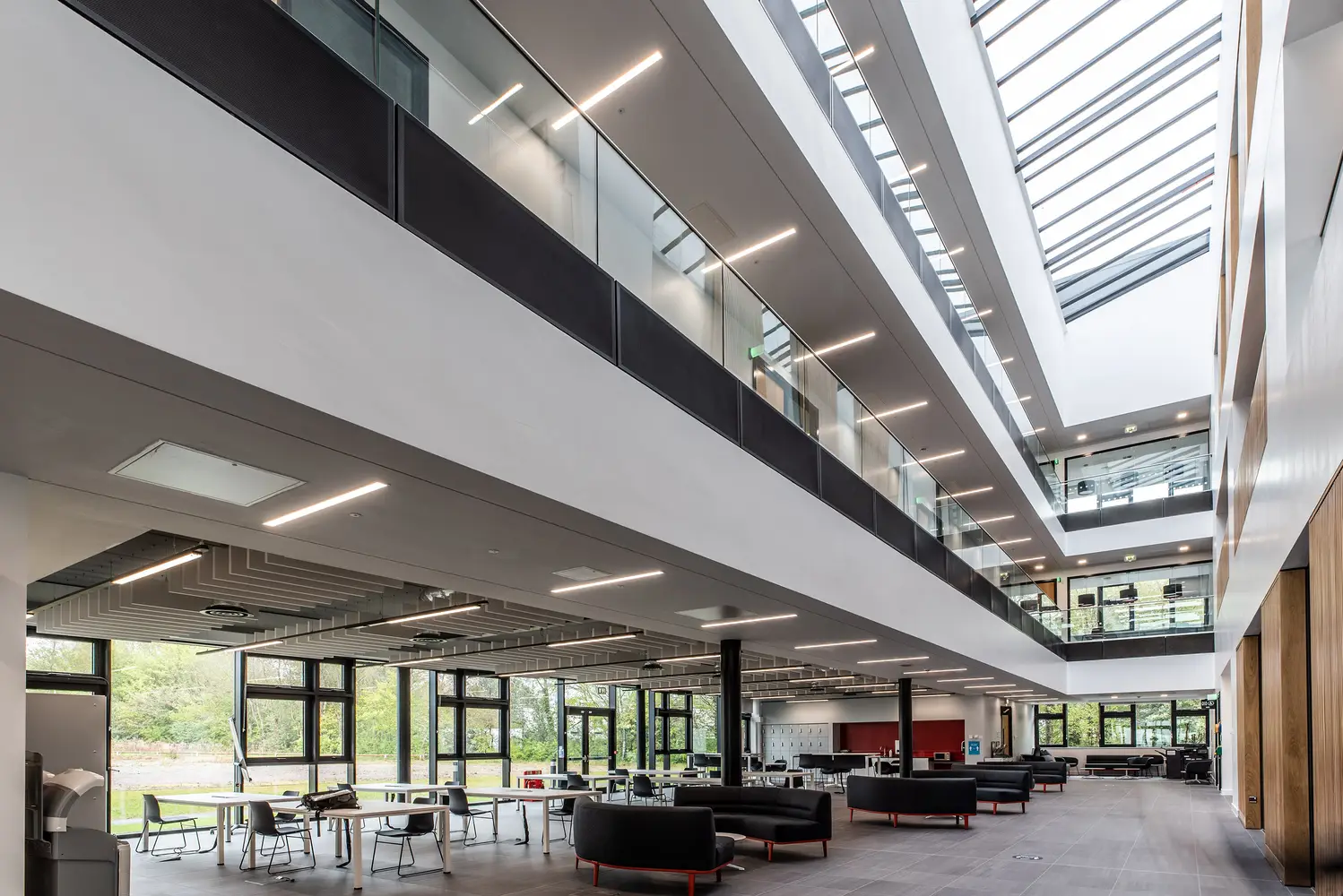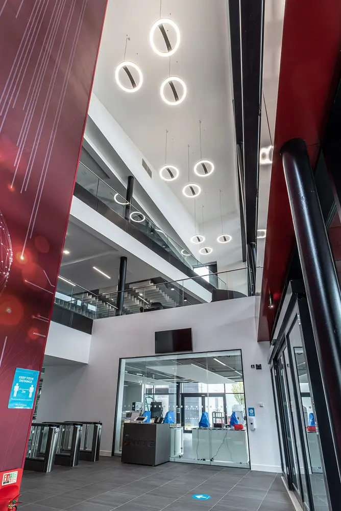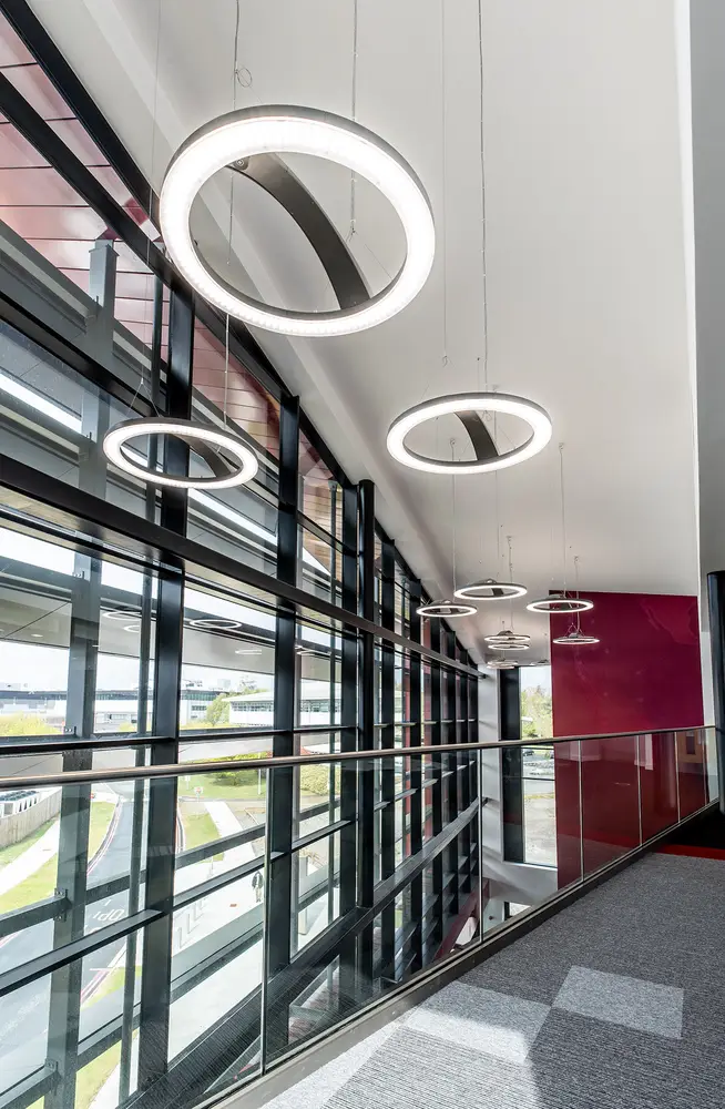 Clara 720 luminaires were chosen for the entrance atrium space. The unique design of the Clara 720 delivers a versatile lighting solution for a wide range of commercial and retail applications. The dramatic circular profile incorporates direct and indirect lighting which enhances the interior environment and creates an elegant effect within the space.