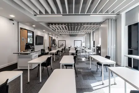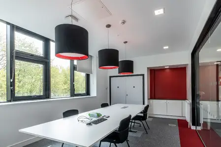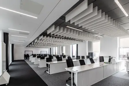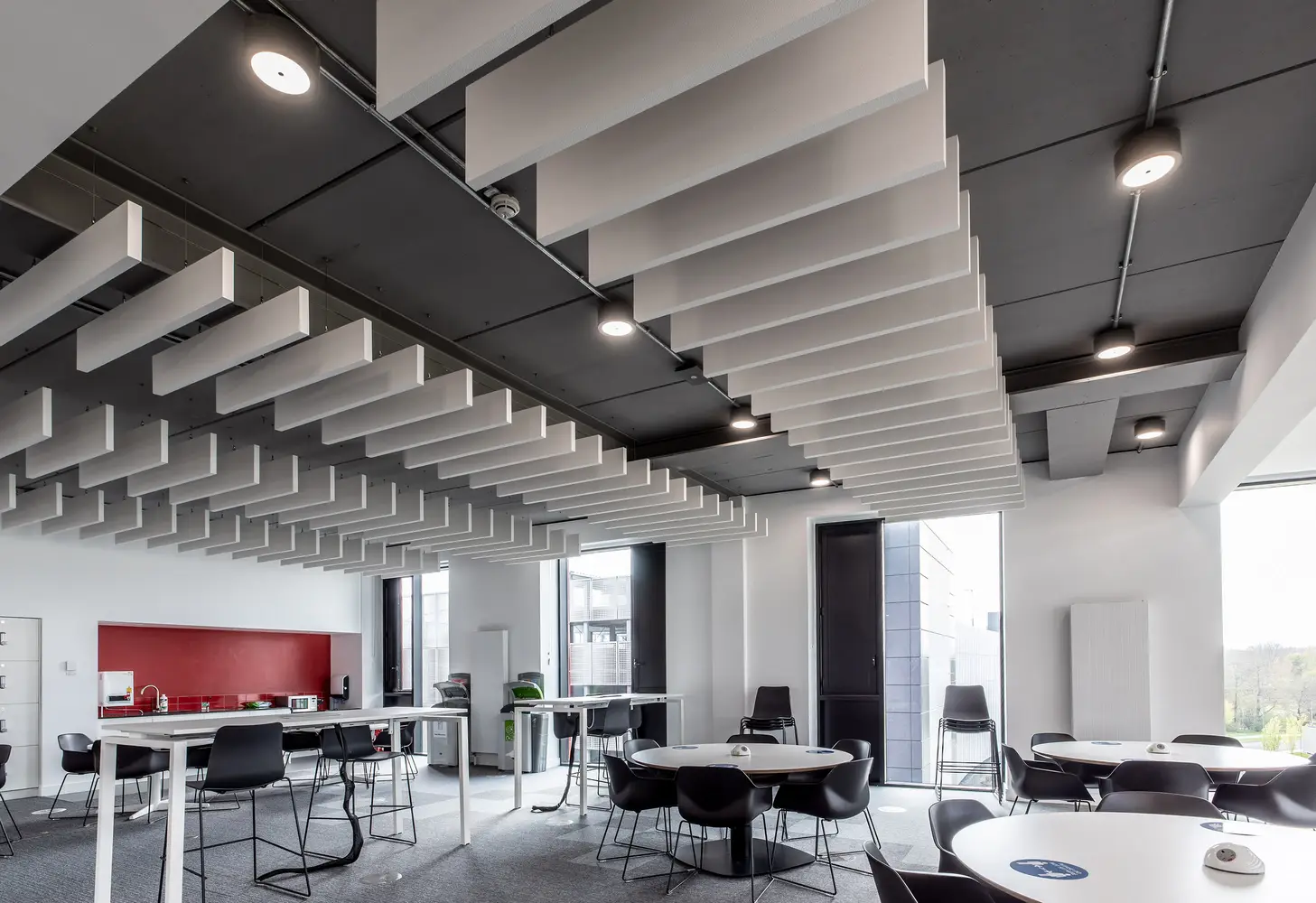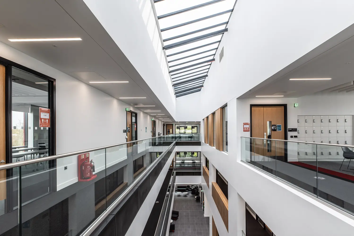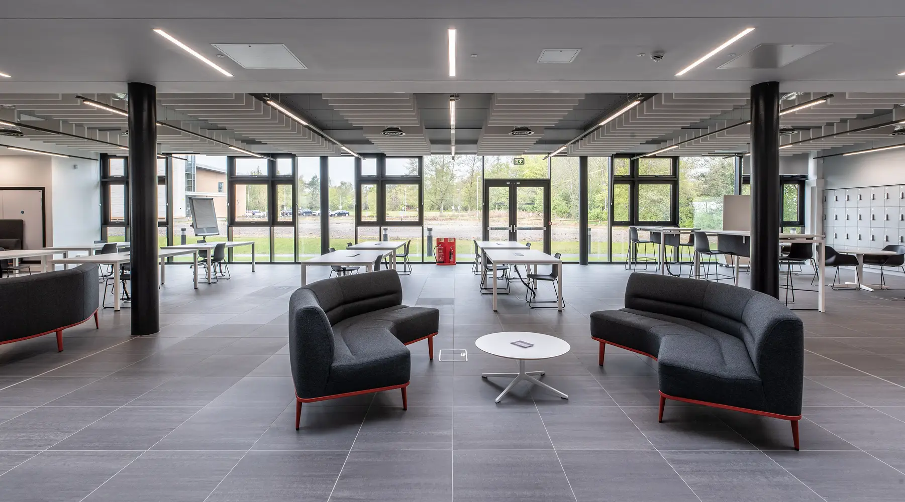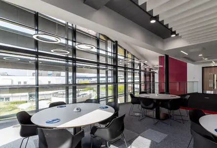 Clara 720 luminaires were chosen for the entrance atrium space. The unique design of the Clara 720 delivers a versatile lighting solution for a wide range of commercial and retail applications. The dramatic circular profile incorporates direct and indirect lighting which enhances the interior environment and creates an elegant effect within the space.