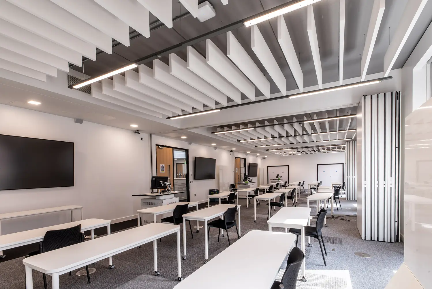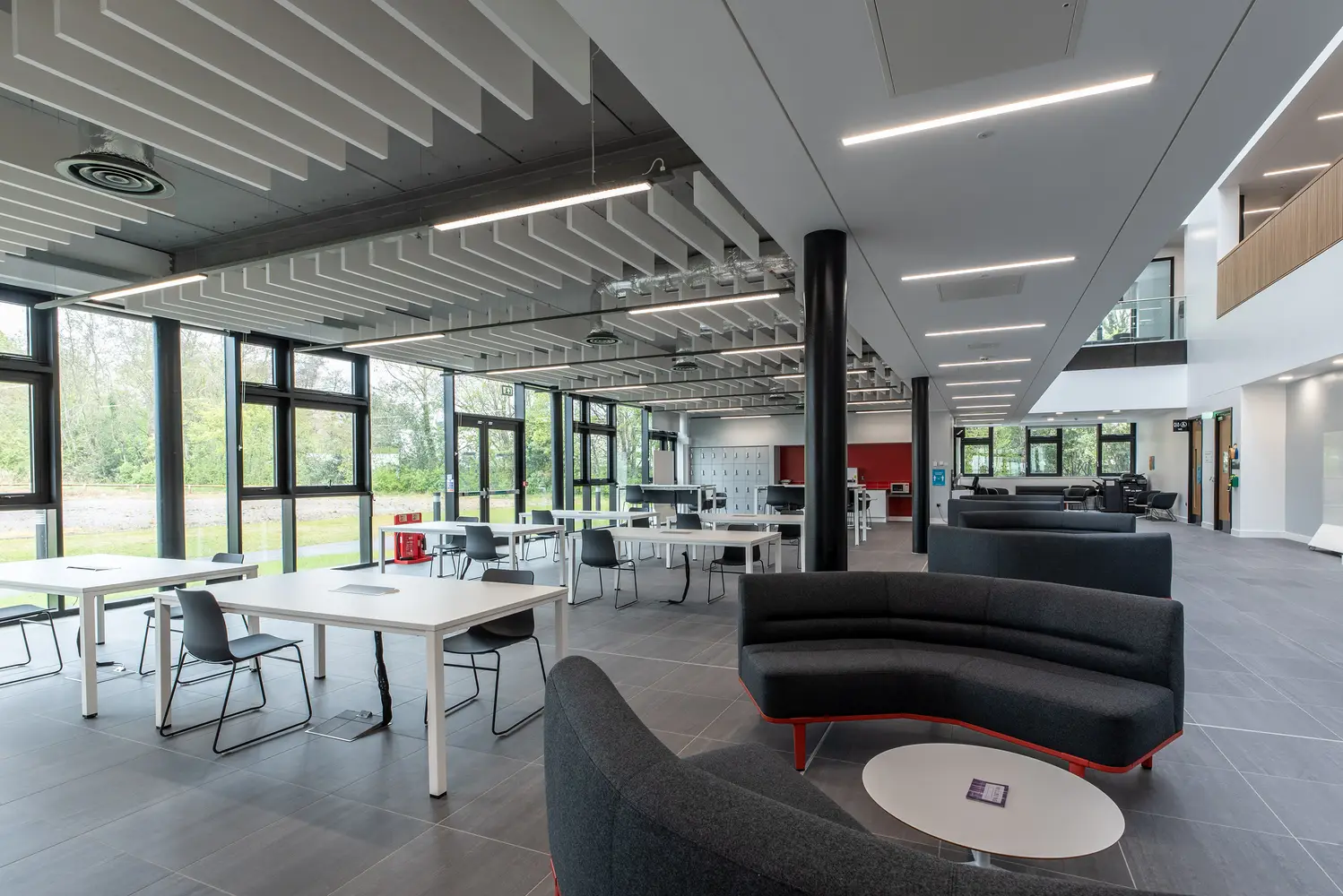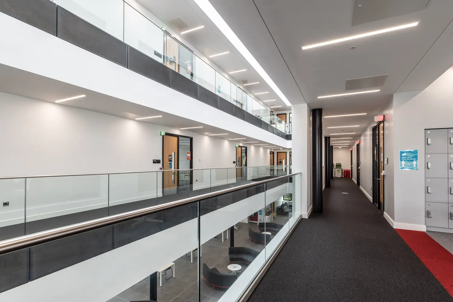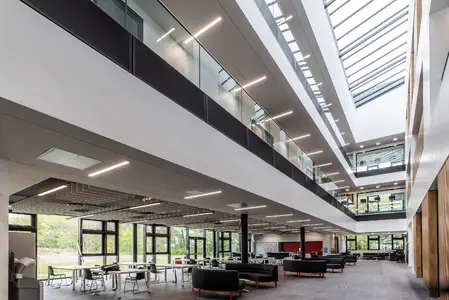 The Zipline has been installed in the open plan study areas. The Zipline combines architectural impact, longevity and supreme efficiency . Extruded aluminium trunking is connected to a range of luminaire modules. These modules can be a combination of luminaire, emergency luminaire, spotlight and passive infra-red detector and are designed to snap into sockets located at regular intervals, ensuring a fast, flexible installation. The Zipline is available with five power options, broad, narrow and double asymmetric light distributions and a variety of accessories.