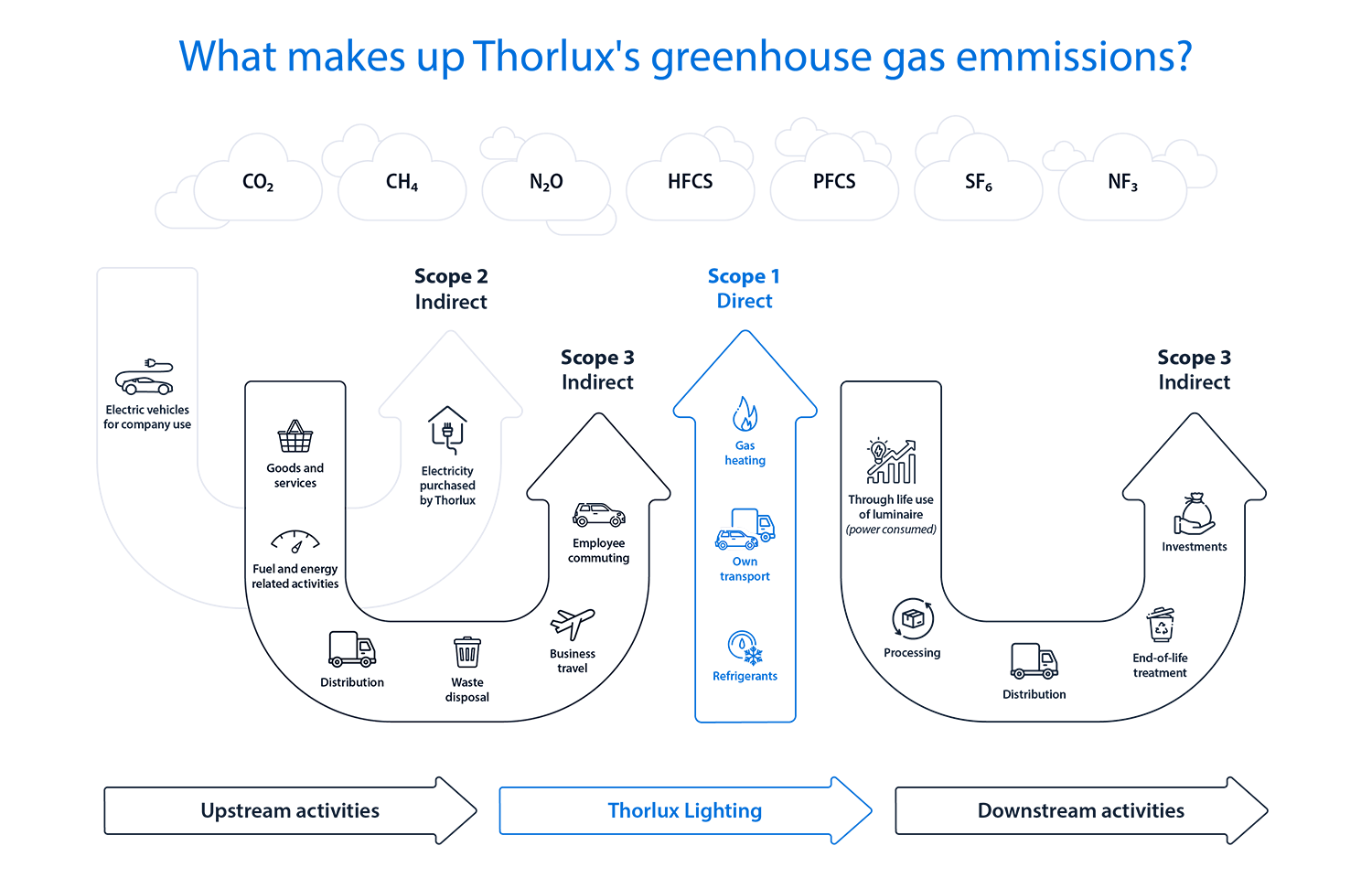 Being carbon neutral means that Thorlux offsets the carbon dioxide emissions it generates through its business activities (see Scopes 1 and 2 of the Greenhouse Gas Protocol).
